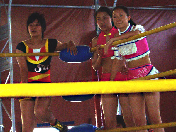 青コーナーで待機しているスイカ(左)、ヘイヘイ(真ん中)、ブンハク(右)