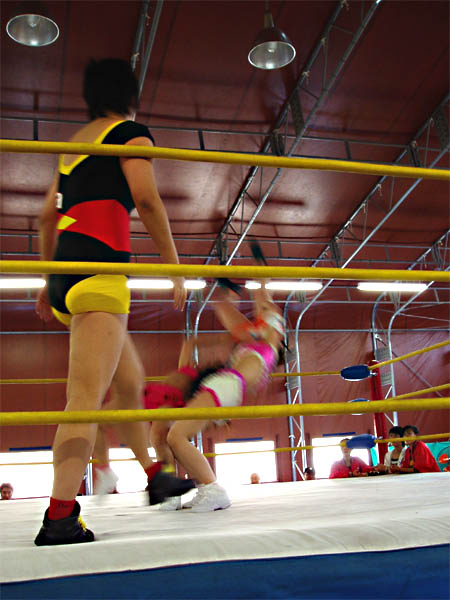 ハリケーンラナをやってのけたヘイヘイ、技をかけられているのはシュンエイ