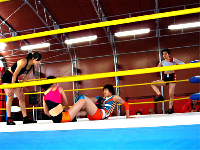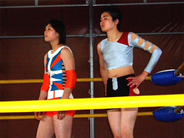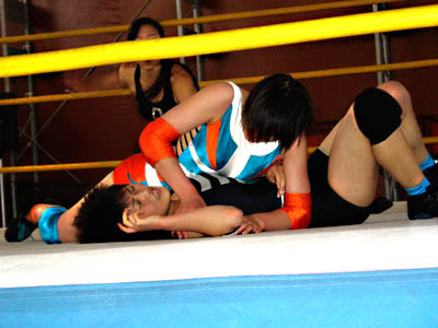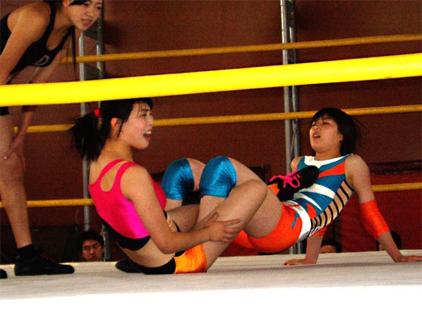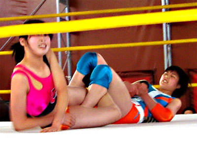 四の字で痛がってるのはウナン、それを覗きこんでいるのはレフリーのテイテイ
