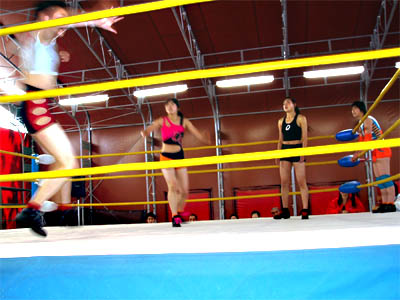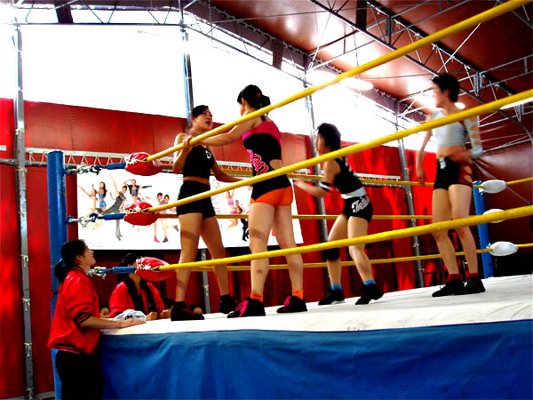 レフリーのテイテイがカタコトの日本語で司会進行をしていました。短期間で日本語がこれだけ喋れるとは、凄いです。 第一試合 (青コーナー)イショウ、セツレンvsウナン、テツ(赤コーナー)