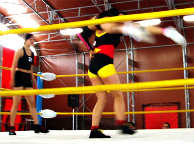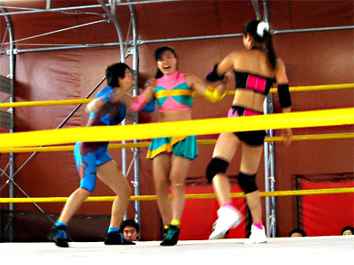 歌と踊りのショーが終わって、試合が始まる前の調整時間に日本人スタッフがぶっちゃけトークを繰り広げて場を和ませます。 オナラがどうとか仰っておりました。レフリーのテイテイがリングアナウンサーも兼ねて、選手を呼び込みます。 メインイベント (青コーナー)オウレイレイ、スイカvsウディ、シエイ(赤コーナー)