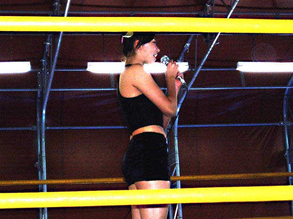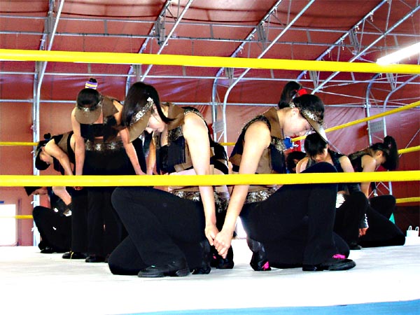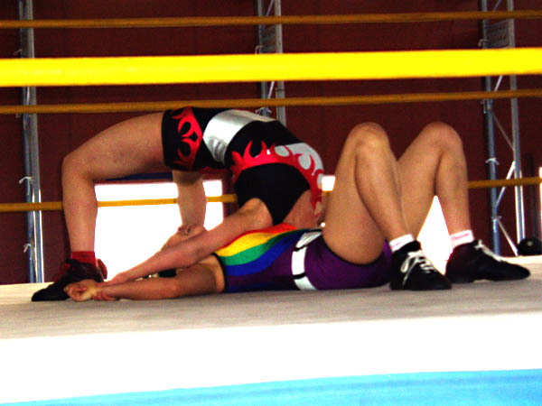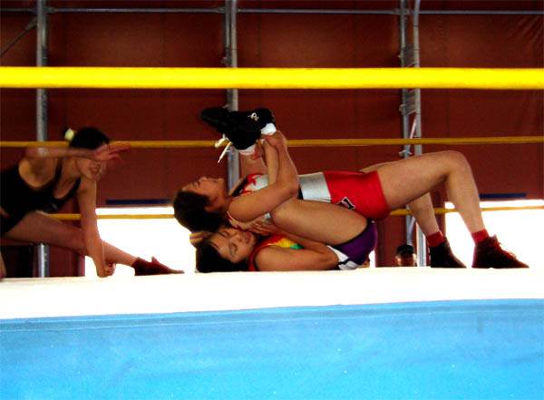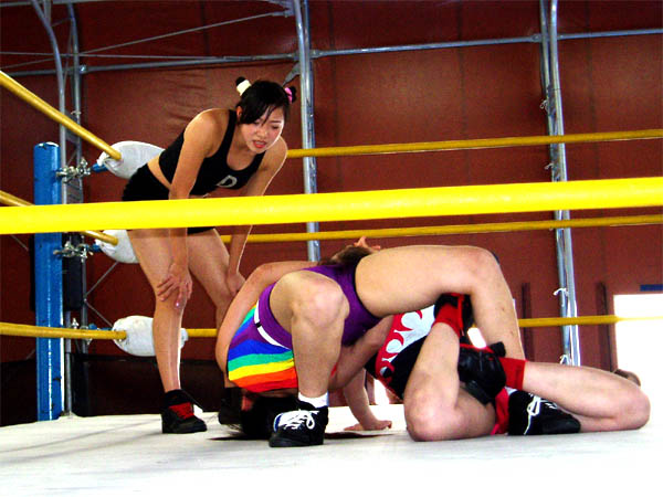 午後の部の開始 14:00スタート 午前と同じくOPダンス 午前と同じくレフリー兼リングアナウンサーのテイテイ、髪型をお団子頭に変えてます(個人的に好感度up)大連の娘にはこの髪型、似合います。 第一試合 (青コーナー)キョウvsショウエイ(赤コーナー) サーフボードストレッチをしている方がショウエイ、仰け反ってるのがキョウ ショウエイのカマ固め 最期はキョウがダブルリストアームサルトを出して終わり。と綺麗な形で記憶に残っています。この試合の勝者はキョウ。 次へ