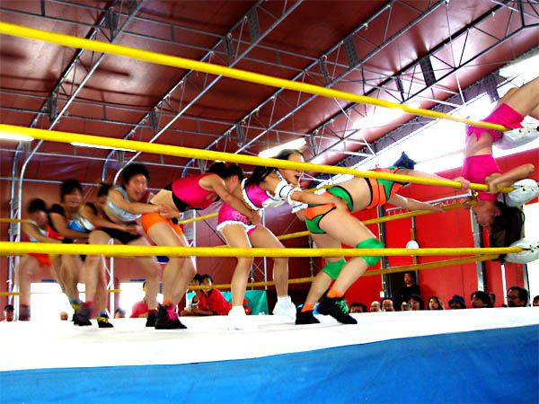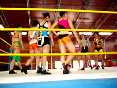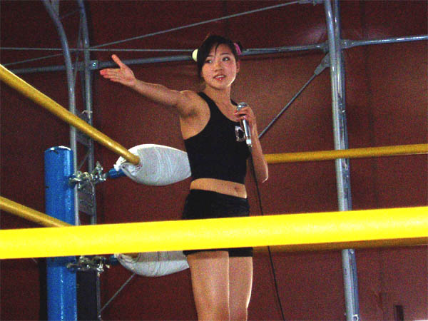 メインイベント(青コーナー)ヘイヘイ、ブンハク、イショウ、スイカvsウナン、レイレイ、セツレン、シュンエイ(赤コーナー)レフリーのテイテイが選手を呼び込むところ
