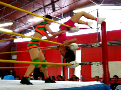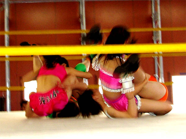 シュンエイ(緑とオレンジの人)がヘイヘイ(ピンクの人)をコーナーに叩きつけて……というのは嘘で ヘイヘイが自分からコーナーに逆立ち上がりして叫んでいたから、シュンエイがそれに釣られて(怪しいけど)コーナーに立ち寄った図